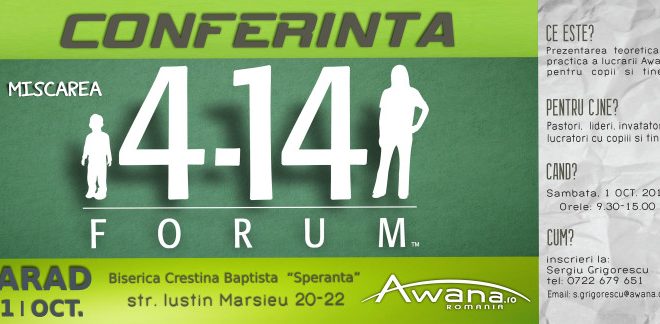 Atunci hai la Forum 4-14 organizat de Awana la Arad pe 1 Octombrie 2016 ora 9.30 Biserica Baptista Speranta