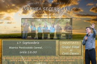 Sambata, 17 Septembrie va asteptam pe cei din Spania sa fiti impreuna cu noi la conferinta de tineret care va avea loc la Ocaña(calle tenorio, nr. 2), tema conferintei fiind „Vremea secerisului”. Va asteptam! Sursa: Misiunea Eldad