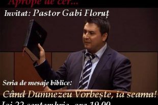 Joi, 22 septembrie 2016, de la ora 19:00 vă invităm la Ekklesia. Proiectul „APROAPE DE CER” continuă…Vino cu cineva drag! ÃŽmpreună cu pastorul GABI FLORUÈš din Oradea. ÃŽncepem împreună seria de mesaje biblice intitulată:CÂND DUMNEZEU VORBEȘTE, IA SEAMA! Vă aÈ™teptam cu drag! Biserica Ekklesia Arad