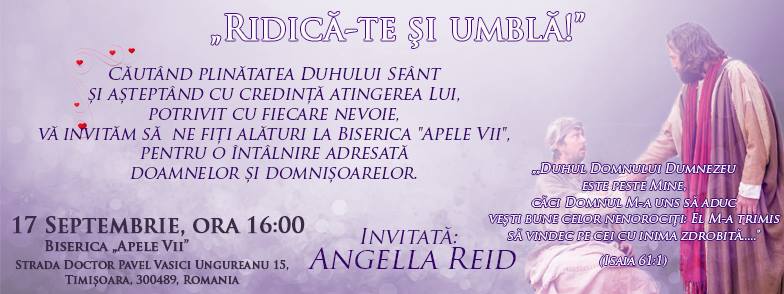 Conferință pentru femei cu Angela Reid la Biserica Apele Vii Timişoara septembrie 13, 2016 Conferinte Leave a comment Share Facebook Twitter Google + LinkedIn Pinterest