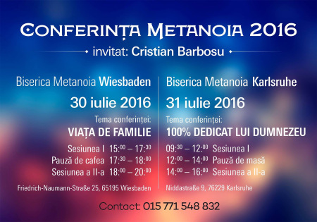 Cristian Barbosu la Wiesbaden si Karlsruhe: 30 si 31 iulie 2016 iulie 22, 2016 Conferinte Leave a comment Share Facebook Twitter Google + LinkedIn Pinterest Sursa:Â germaniaevanghelica.wordpress.com