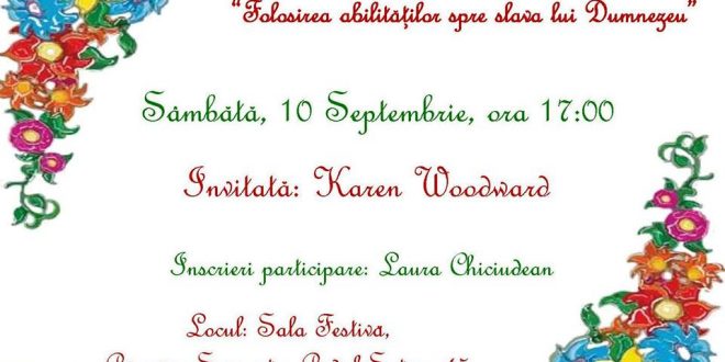 Întâlnire pentru Doamne și Domnișoare cu Karen Woodward la Biserica Baptistă Speranța Brașov august 28, 2016 Conferinte Leave a comment Share Facebook Twitter Google + LinkedIn Pinterest