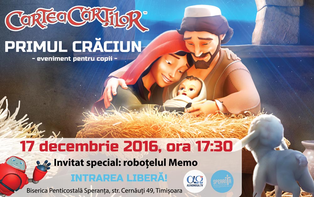 Cartea CărÈ›ilor vine în TimiÈ™oara! Alfa Omega TV împreună cu Biserica Penticostală SperanÈ›a din TimiÈ™oara organizează primul eveniment pentru copii „Cartea CărÈ›ilor”. Vă aÈ™teptăm în 17 decembrie, ora 17:30, cu copiii voÈ™tri ca să pornim în aventură alături de eroii desenelor Cartea CărÈ›ilor, Cristi, Oana È™i Memo care sunt teleportaÈ›i în vechime, pe dealurile Betleemului unde sunt martorii naÈ™terii lui Isus.