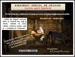 „Va invitam la o calatorie in timp si vrem sa traim impreuna emotiile PRIMULUI CRACIUN!” Decor in aer liber cu casute din lemn, torte, personaje in costume de epoca, ieslea cu Pruncul Isus, Iosif si Maria, animale, activitati pentru copii, colinde, ceai cald si o atmosfera de sarbatoare. Evenimentul va avea loc in zilele de 12, 13 si 14 decembrie, intre orele 18:00 si 21:00, in curtea bisericii baptiste Maranata din Timisoara, zona Soarelui, paduricea Giroc, colt Versului cu Sanatatii. INTRAREA LIBERA!Â