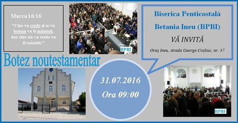 Duminică, 31.07.2016, ora 09:00, Biserica Penticostală Betania Ineu vă invită să luați parte la bucuria bisericii și a cerului, având loc actul botezului în apă! Vă așteptăm cu toată dragostea la părtășie, în prezența Domnului prin Duhul Sfânt, a Cuvântului Scripturii, a cântărilor duhofnicești și a slujitorilor!