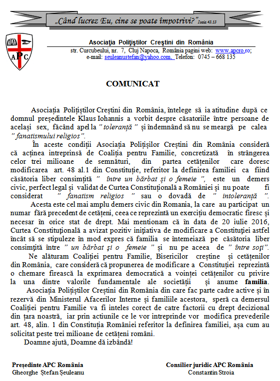 Comunicat – AsociaÈ›ia PoliÈ›iÈ™tilor CreÈ™tini din România octombrie 26, 2016 Diverse Leave a comment Share Facebook Twitter Google + LinkedIn Pinterest