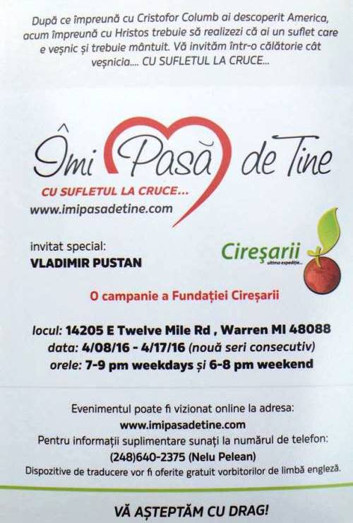 Evanghelizare cu Vladimir Pustan la Detroit aprilie 3, 2016 Evenimente Crestine Leave a comment Share Facebook Twitter Google + LinkedIn Pinterest