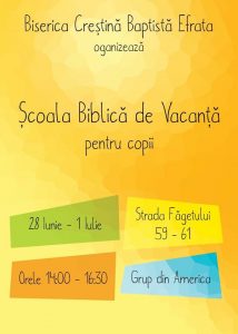 Școală Biblică de Vacanță la Efrata-Lugoj iunie 25, 2016 Evenimente Crestine Leave a comment Share Facebook Twitter Google + LinkedIn Pinterest