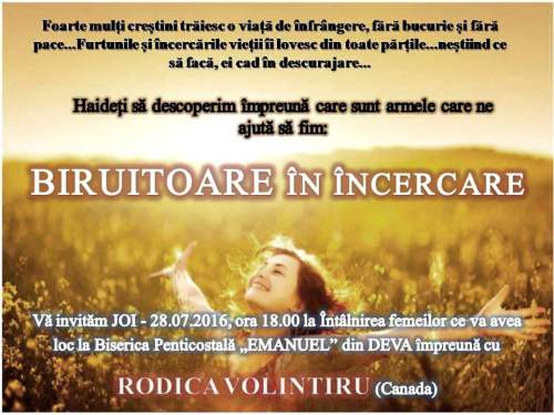 Deva: ÃŽntâlnire cu Rodica Volintiru,â€Biruitoare în încercareâ€- BCP Emanuel, 28 iulie 2016 iulie 22, 2016 Femei Leave a comment Share Facebook Twitter Google + LinkedIn Pinterest Sursa: hunedoaraevanghelica.ro
