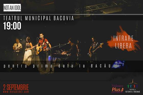 Vineri, 2 septembrie 2016, ora 19:00, la Teatrul Municipal Bacovia va avea un concert gratuit cu trupa Not an idol, organizat de Biserica Sfanta Treime Bacau in parteneriat cu Asociatia Valoare Plus.