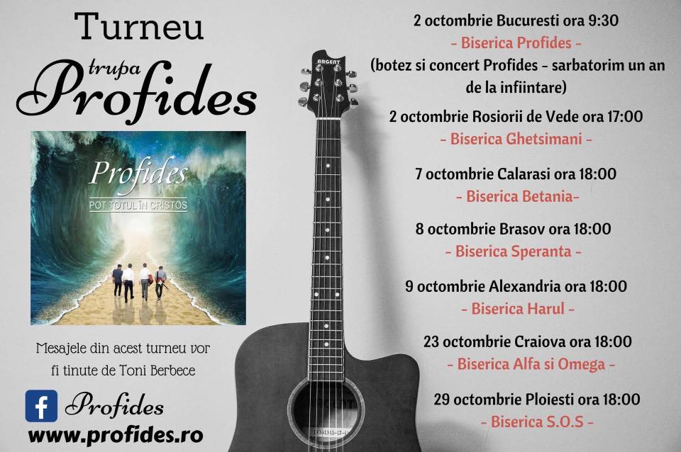 Turneul trupei Profides va incepe cu Biserica Profides unde vom sarbatori un an de la infiintare iar sarbatoarea noastra va avea ecou pana in Cer pentru ca ne vom bucura de legamantul unor oameni dragi cu Domnul in apa botezului. Va asteptam cu drag!