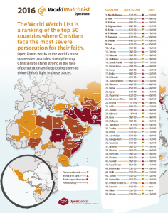 Perioada de investigație pe care se bazează raportul Open Doors este 1 Noiembrie 2014 – 31 Octombrie 2015. Topul primelor 10 țări din World Watch List este următorul:
