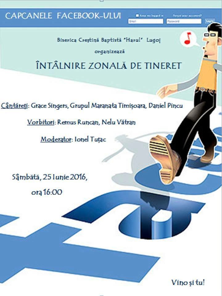 Întâlnire de tineret la Lugoj iunie 19, 2016 Tineri Leave a comment Share Facebook Twitter Google + LinkedIn Pinterest