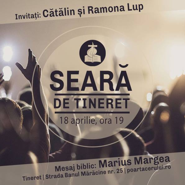 Săptămâna aceasta, vă așteptăm la tineret cu un mesaj adus de Marius Margea, și ne bucurăm să îi avem alături pe Cătălin și Ramona Lup! Vom sta în închinare, ascultare, iar apoi într-un timp de calitate petrecut împreună, la părtășie. Vă invităm cu mult drag!